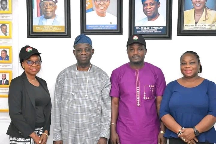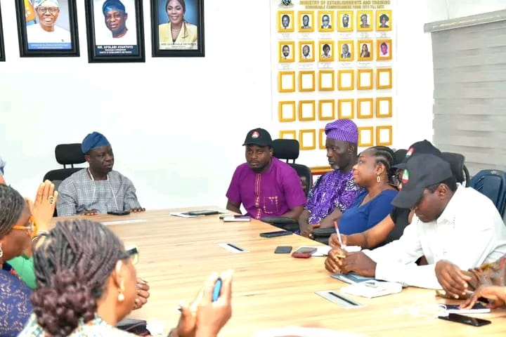 The newly elected State Administrative Council members of the Trade Union Congress of Nigeria (TUC) under the leadership of the Chairman, Comrade Aladetan Abiodun paid a courtesy visit to the Honourable Commissioner for Establishments and Training, Hon Ayantoyo Afolabi along with other Management Staff of the Ministry.
